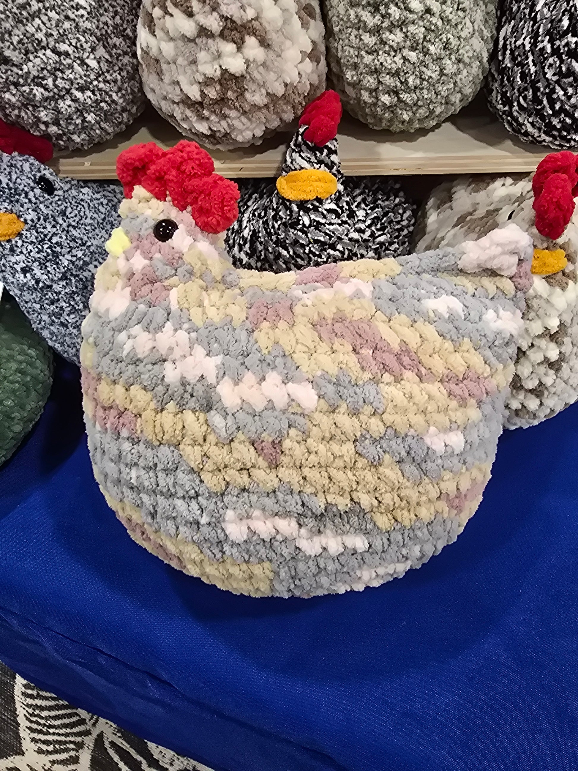 Handmade, soft with safety eyes! This chicken is approximately 12" tall. Please allow 7-10 business days for your item to be made before it's ready for pickup or shipment.
