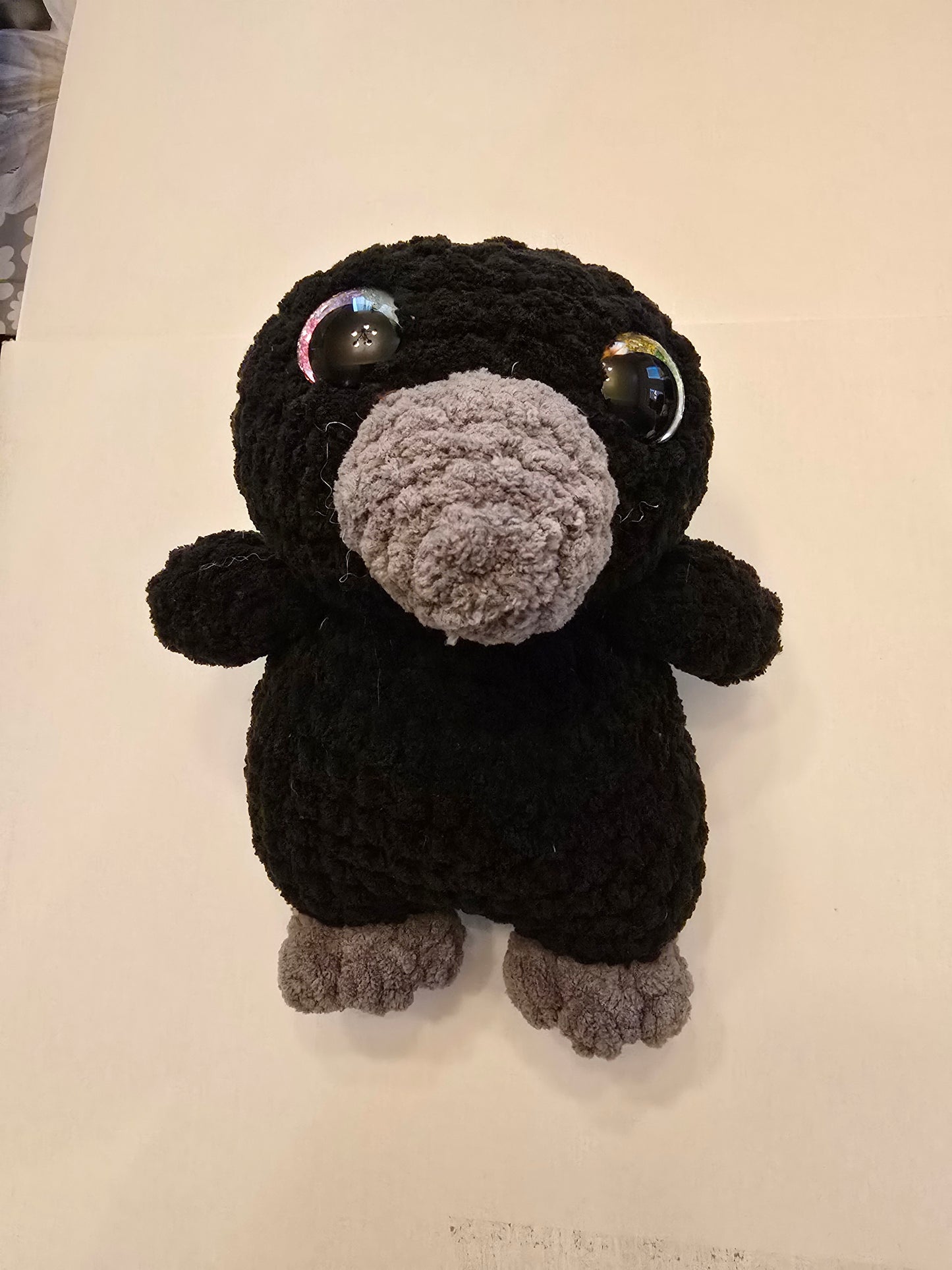 Handmade, soft with safety eyes! This Crow is approximately 8" tall. Please allow 7-10 business days for your item to be made before it's ready for pickup or shipment.